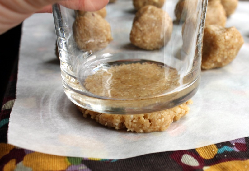 When all of the dough has been rolled into balls, use a flat bottomed glass to smoosh each ball into a thin cookie.