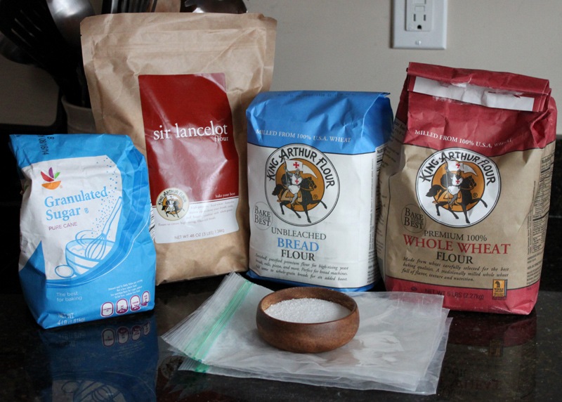 I mix all of my flours (King Arthur Sir Lancelot flour, King Arthur bread flour, King Arthur whole wheat flour), sugar, and salt together in 6 plastic ziplock bags. That way on Sunday all I need to do is pour the bag into my stand mixer, attach the dough hook, add the yeast, water, and olive oil, and let it rise!