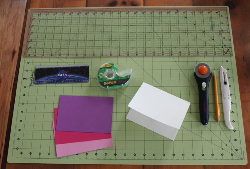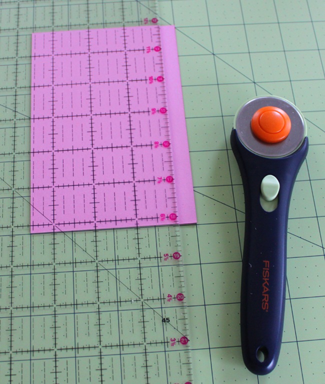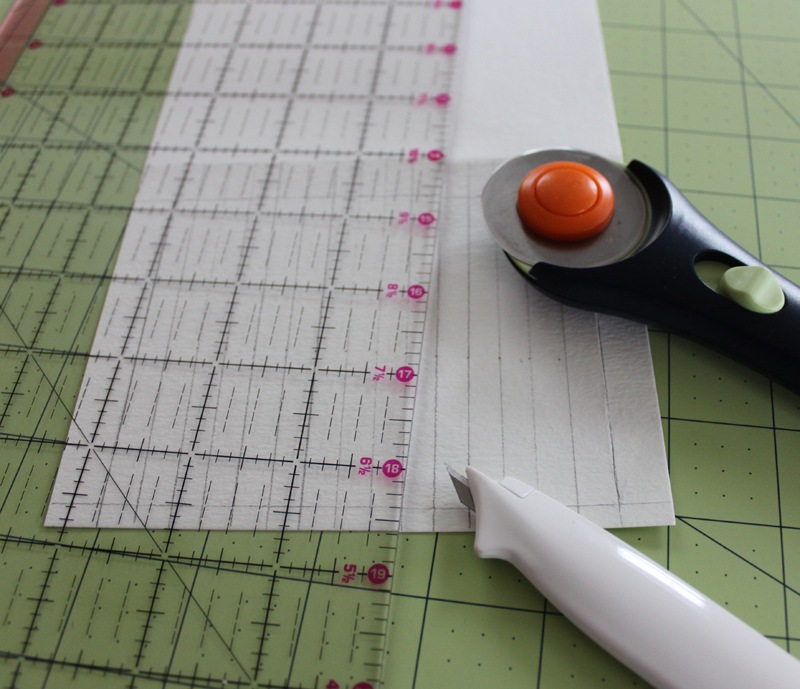 Using my rotary cutter and acrylic ruler, I cut the colored cardstock into nine 1cm strips.