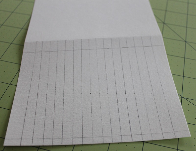 I measured three .5cm margins and one .25cm margin around the outer edge of the card. Inside the margins, I measured and sketched out fifteen .75cm parallel lines.