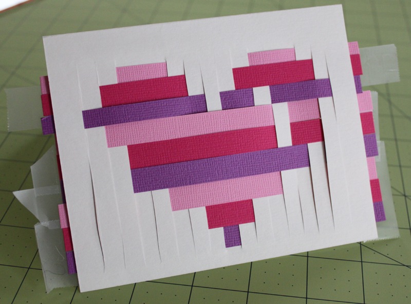 The design is also totally customizable. The aim of this tutorial is to show the woven paper technique. I loved the look of MiniEco’s pixelated heart, and kept the white spaces at the top, but you can modify it to whatever look you like best. When the design is done, make sure to snip any excess paper and tape down the edges of the colored strips.