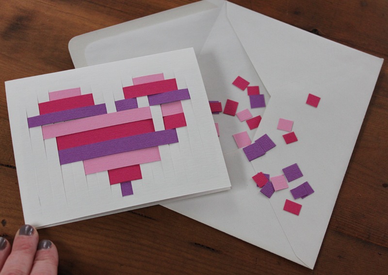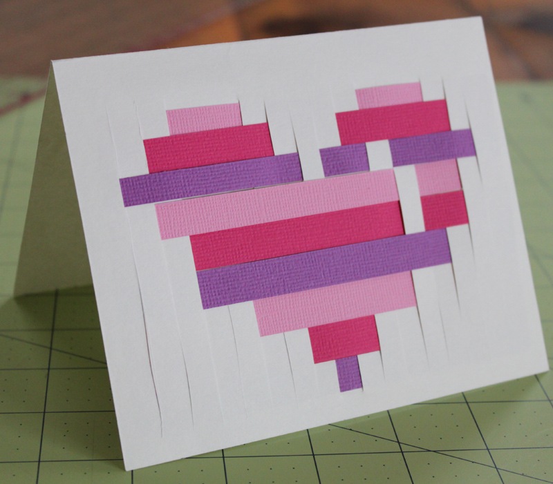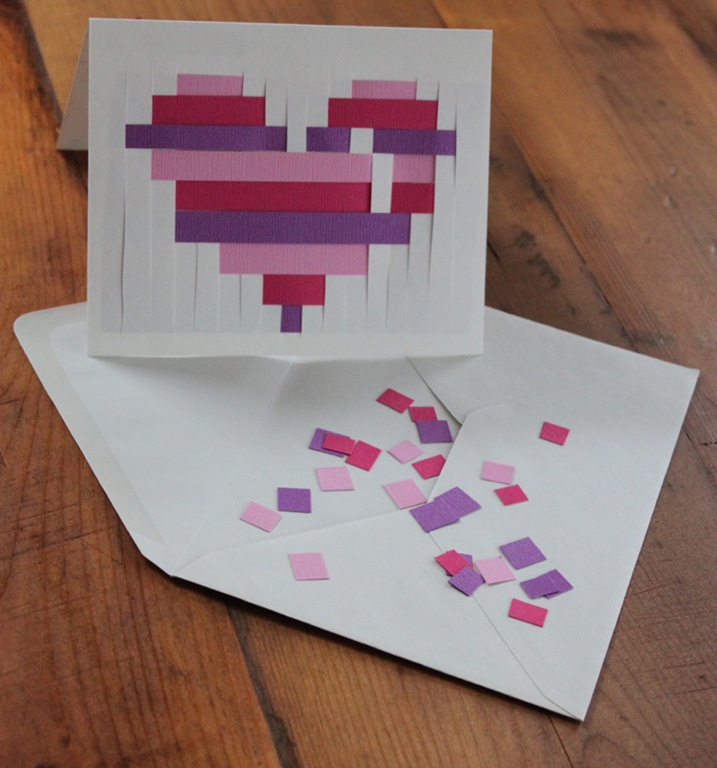 Valentine’s Day is this week! While I love celebrating with my hubs I prefer homemade treats or doing something special together instead of buying presents (needless consumerism makes me feel kinda yucky). Our annual V-Day tradition is to go out for afternoon tea (which we did on Sunday despite the blizzard this weekend) but I wanted to make John a card too. I saw this adorable woven heart card on MiniEco. I followed their design but made a few of my own tweaks.