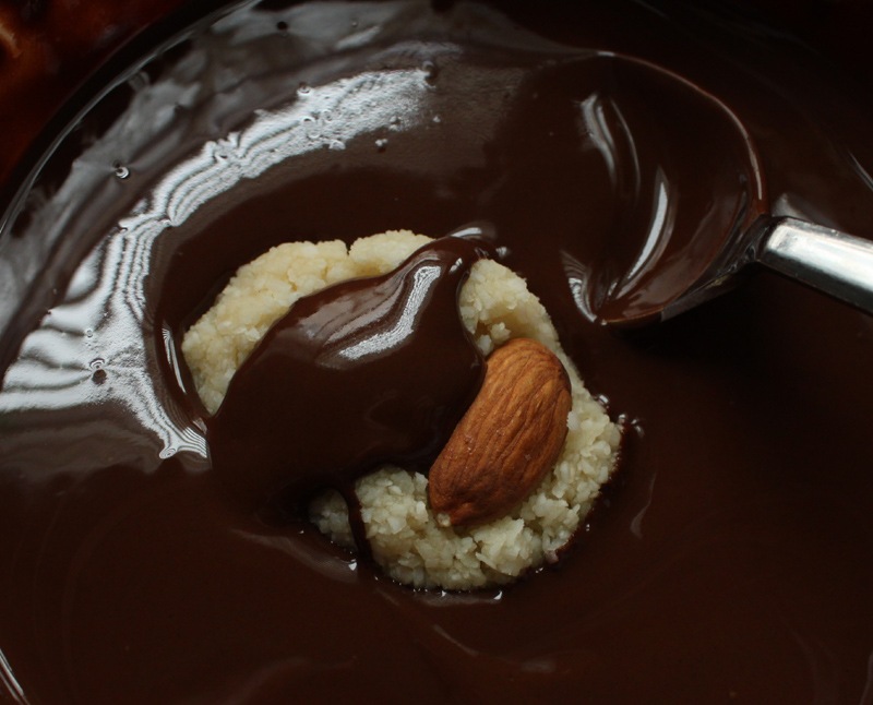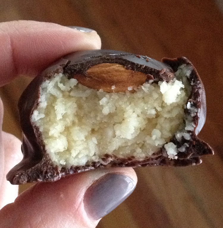 I’m not joking when I say that this recipe was as good, if not better, than the real thing. The coconut was moist and chewy, the almonds add the perfect crunch, and the chocolate shell is a great compliment to the overall taste.