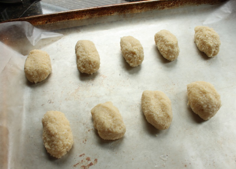 Spoon out a heaping tablespoon of the coconut mixture and roll between your hands to form an oval shape. Place the ovals on a nearby cookie sheet lined with either wax or parchment paper.