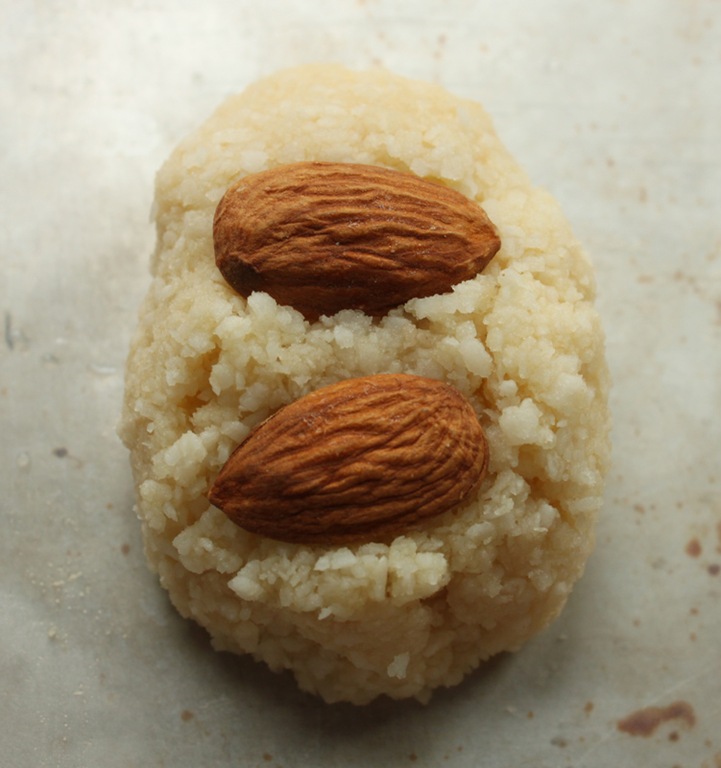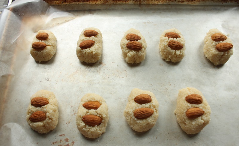 Press two almonds into the top of each coconut oval. At this point, the dough needs to chill and set. Place the entire pan in the fridge for a minimum of one hour (you could totally leave them overnight though).