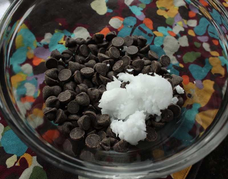 Stir with a heat-safe/silicone spatula until the chocolate and coconut oil have melted together and the mixture is smooth. Let the chocolate cool for a few minutes.