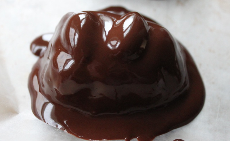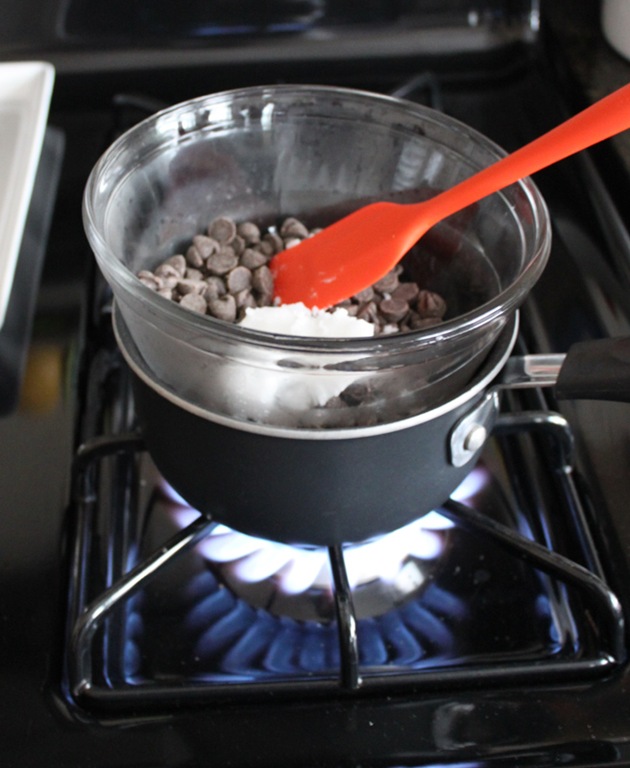 Right before the dough is done chilling, make the chocolate for the exterior. Heads up – this is totally magic shell. Melt the chocolate and coconut oil over a double boiler.