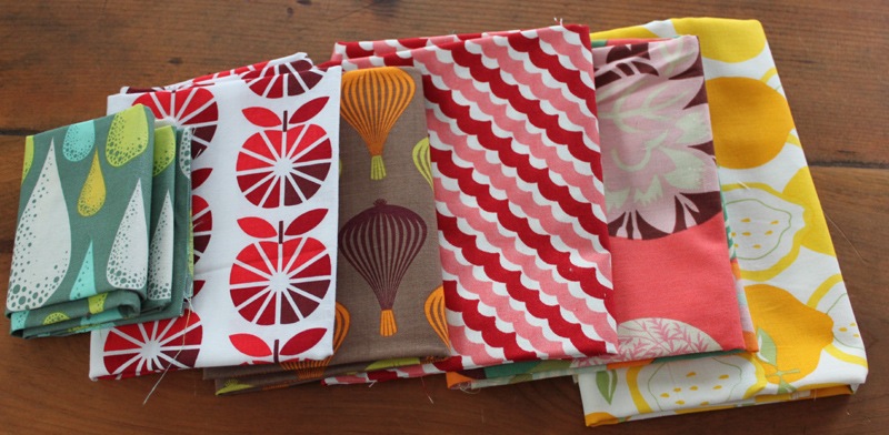 Totally intrigued, I had to try making one myself. Two snowy weekends in a row had me itching for a good craft project so I got to work! Over the weekend I organized my entire fabric collection so I knew I had a lot of options to choose from. You need six different kinds of fabric for the Scrappy Trip Along (STA) block and I chose these: