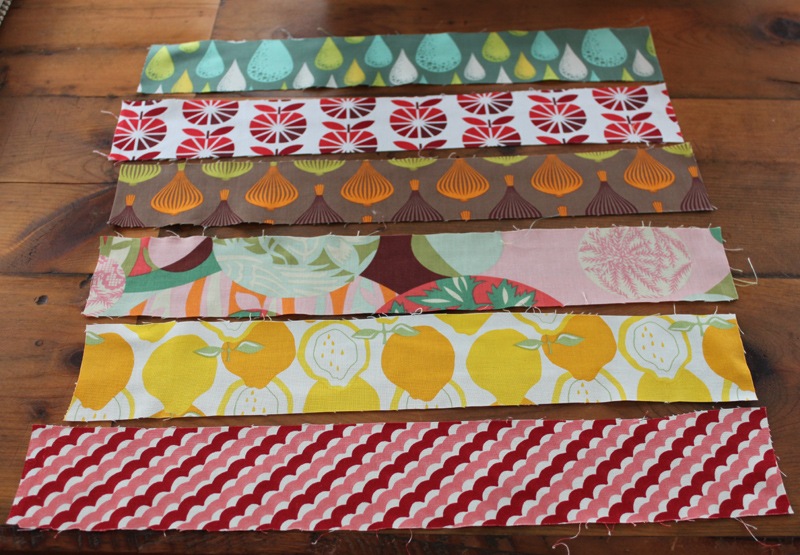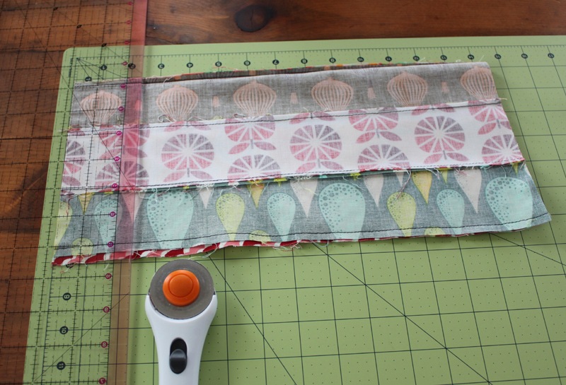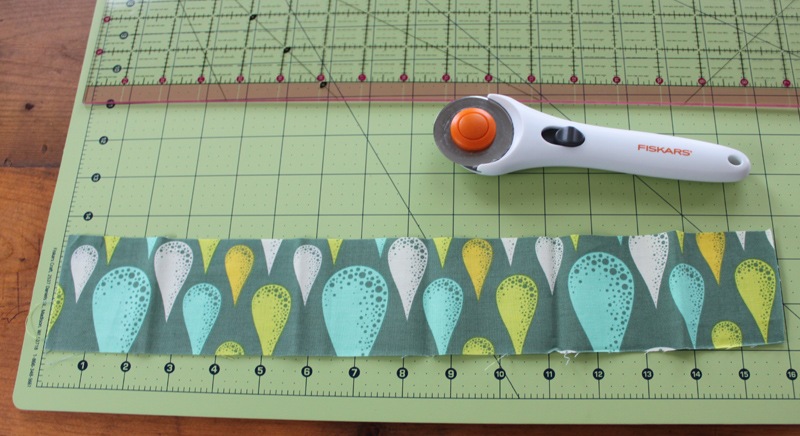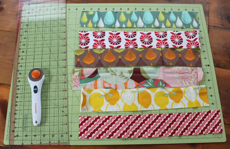 To start I cut six 2.5″ x 16″ strips of fabric with my rotary cutter.