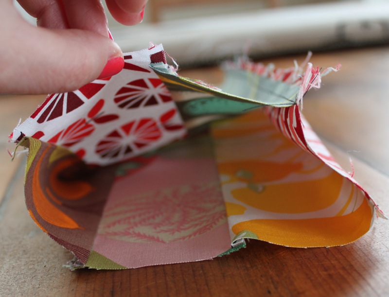 On to the fun part! Using a seam ripper, rip one seam open on each tube strip. Alternate between which blocks you rip each seam so you are left with a row of blocks that vary in appearance. I hope that makes sense but if not, the pictures will help.