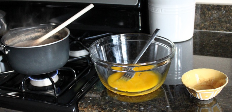 While the base is done, prepare the egg yolks for tempering. Whisk them together in a separate, heat-safe bowl. To temper the eggs: Take a cup of the hot mixture and slowly pour it into the bowl of yolks, whisking quickly and constantly. You have to do this slowly or you’ll end up with scrambled eggs. A good assembly line (see below) really helps!