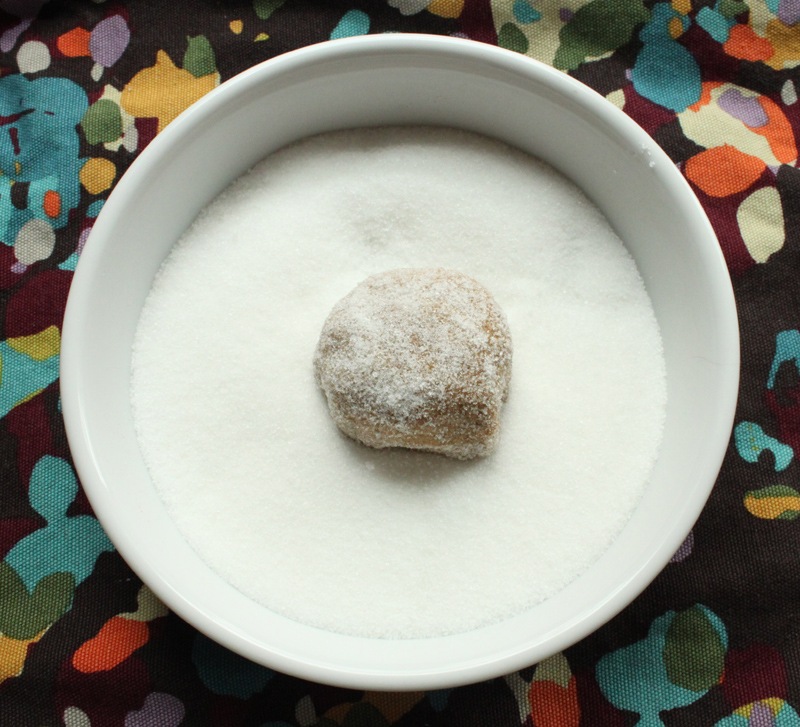 Measure out 3 tbsp. of granulated sugar and place in a small bowl or dish. Roll in your hands to make the shape as uniform as you can then toss each cookie dough ball around in the sugar until the entire surface is coated.