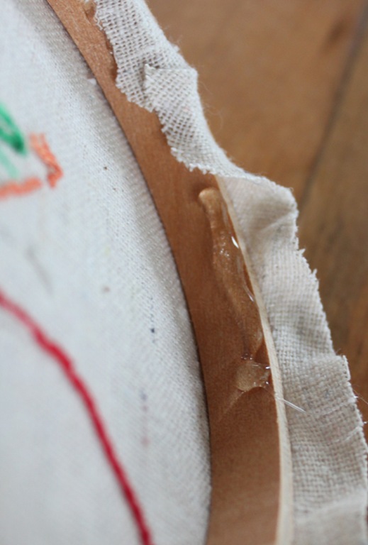 I used my hot glue gun to secure the excess fabric down to the interior embroidery hoop, working in small sections to avoid any mistakes (or burns!).