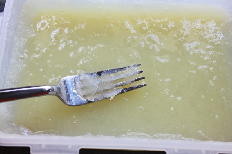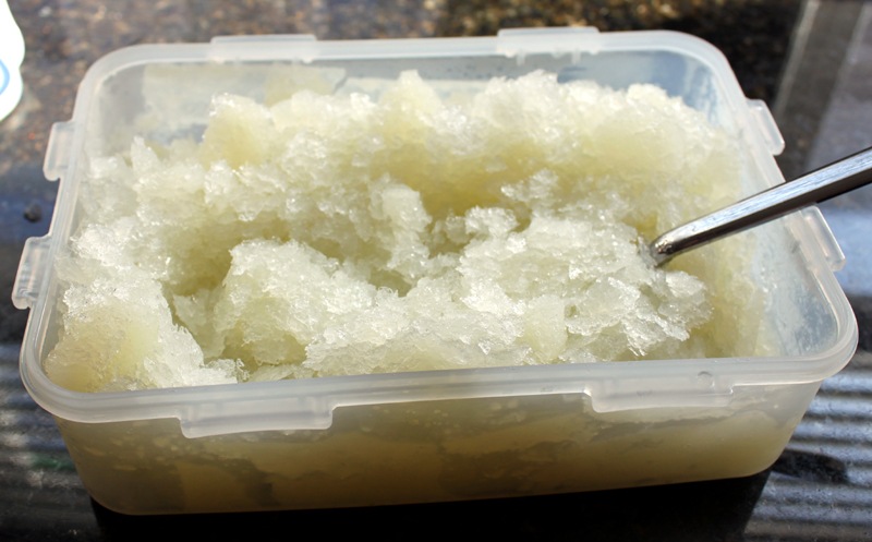 After you’ve first put it in the fridge, leave your lemon/water mixture alone for about 3 hours. After that time take it out and you should notice that ice crystals have begun to form (see picture on the left). Using a fork, scrape the entire mixture to form a flaky texture. Put it back in the freezer for 30 minutes and repeat this process for as many rounds as you need to until the ice mixture looks like the picture on the right. For me it took a total of about 5 rounds.