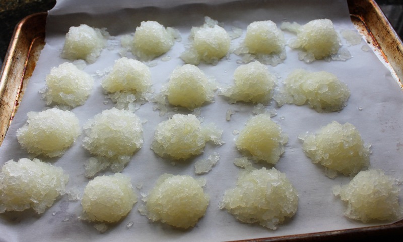 When the mixture is finished you have a granita! Using my #20 ice cream scooper I scooped ice cube sized granita balls on to a parchment paper lined baking sheet and stuck them in the freezer for another hour. These will keep in an airtight container indefinitely.