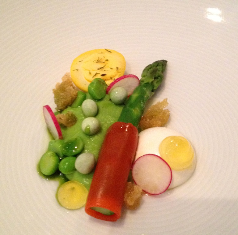 English Pea “Potage” – pickled quail egg, green asparagus, d’avignon radishes, garden mint, and country bread croutons.