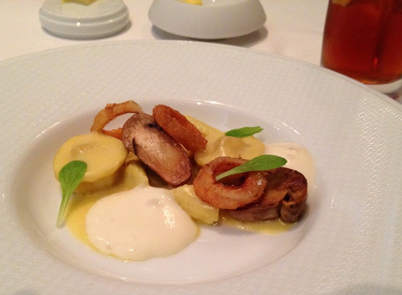 Marscapone-Enriched Sunchoke Tortellini – roasted Oregon cèpes, Cope’s corn pudding, young corn confit, arrowleaf spinach, and vidalia onion soubise.