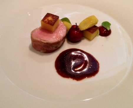 Marcho Farms Nature-Fed Veal Rib-eye – Hobb’s bacon, Cope’s corn cake, brooks cherries, mache and balsmic jus.