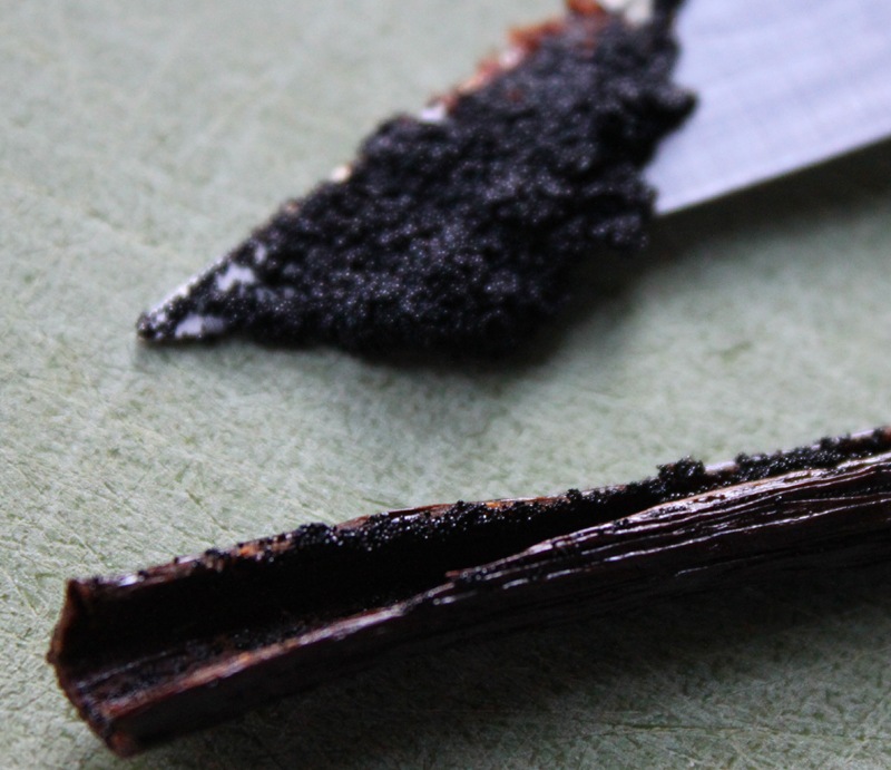 First, get your sharpest paring knife, slit the vanilla bean down the center, spread open in half, and lightly scrape the seeds out with the edge of your knife.