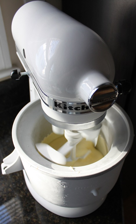 When the batter has chilled overnight, it’s time to make ice cream! According to your ice cream mixer manufacturer’s instructions, mix the batter in the attachment bowl until it becomes ice cream. For my KitchenAid, this takes 20-30 minutes.