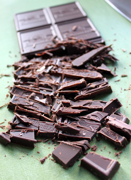 Lastly, add the chocolate. You can use chocolate chips, chunks, anything really. I bought this intense dark Ghirardelli bar and chopped it up myself.