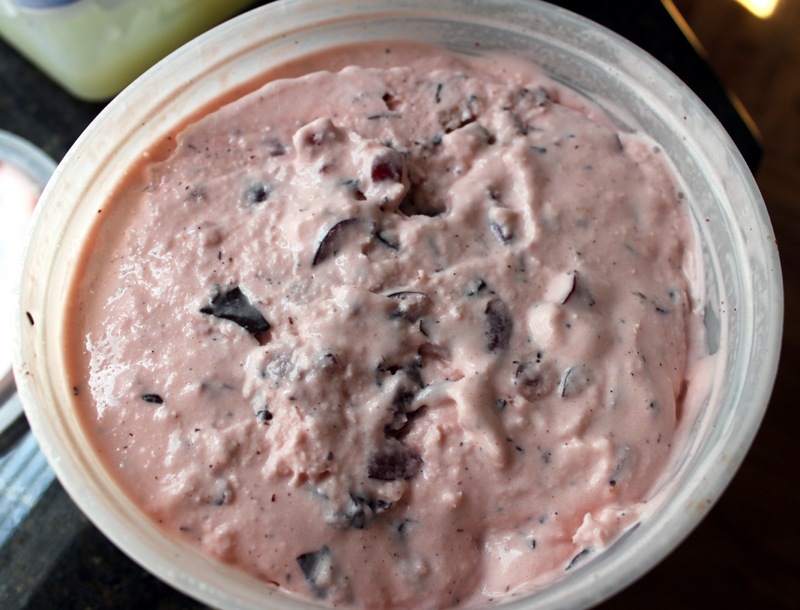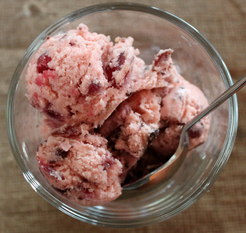 The cherry juice tinted the ice cream slightly but I wanted a deeper pink color. I added 3-5 drops of red food coloring but this is totally optional.