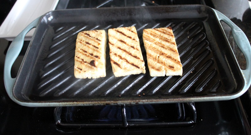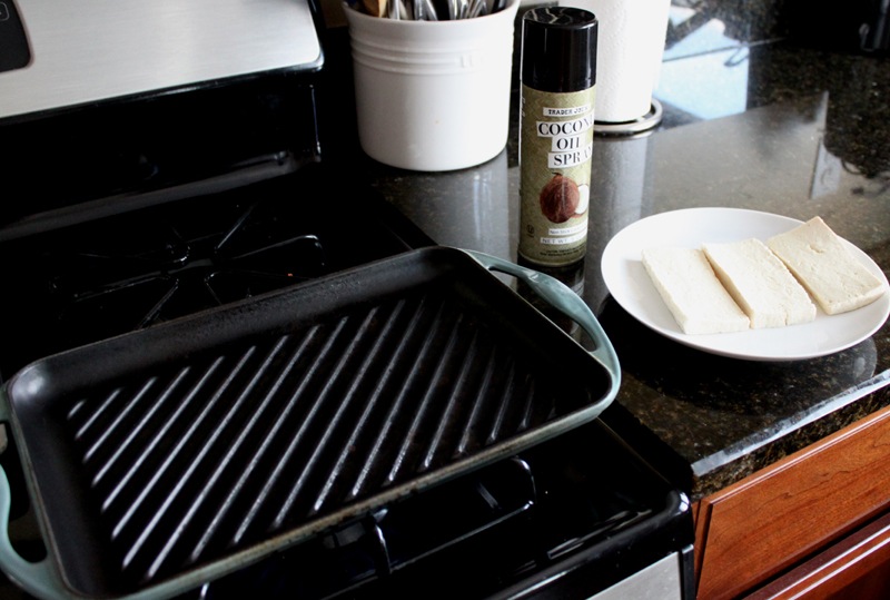 The first step is to prep the tofu. You could throw it into the pot as is with the veggies but I like a really nice sear on my tofu so I grilled it first. There’s better flavor and texture that way. Get a grill pan or saute pan screaming hot over high heat. Spray down with a non-stick spray (I’m loving Trader Joe’s Coconut Oil Spray for this) and place the tofu down gently. Grill for 1-2 minutes, or until you get those great grill marks, and then flip and do the same on the opposite side. When it’s done, set aside to cool.