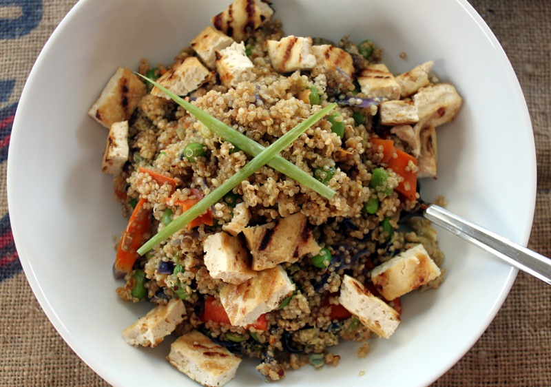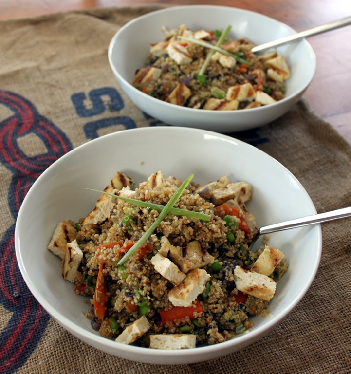 When the veggies are done, stir in the cooked quinoa. I cooked this separately in a small pot while I grilled the tofu. At this point cube up the tofu and toss it in the pot too.