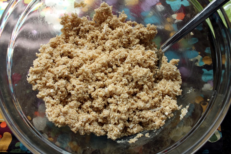 Dump the ground dry ingredients into a big bowl and mix in the wet ingredients (agave, maple syrup, and vanilla). Make sure everything is thoroughly combined.