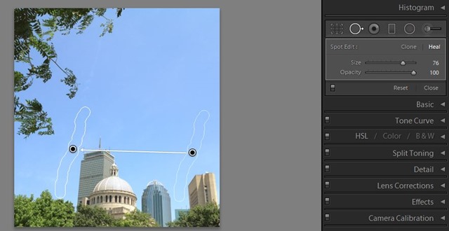 This might be my favorite feature of them all. The Advanced Healing Brush in Lightroom allows you to easily remove imperfections that may show up in your pictures. Prior versions of Lightroom, and most of the Adobe catalog of photo editing software, used to only allow for “spot removal” with a circular brush. This tool now allows for non-circular editing which is so much more diverse. See my photo below that captured a plane’s exhaust trail. I used the Advanced Healing Tool to select the oddly shaped area then told it what to replicate to replace the space with (another similar gradient of sky colors).