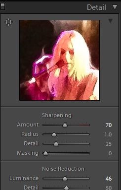 I have found that no matter how good photo editing software is, a blurry photo is a blurry photo. That said, the Sharpening tool in Lightroom stands apart for me because of the Noise Reduction slider that pairs with it. For example – have you ever noticed when you try to sharpen a a blurry image it starts to look grainy or pixelated? That’s called “noise.” As you can see, the photo below is still pretty blurry (because I was super far away at a concert) but the lines look pretty smooth after I sharpened it because of the noise reduction tools.