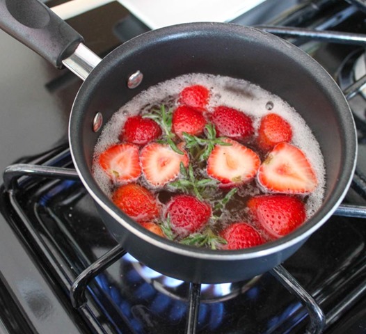 Simmer on medium-high heat until the strawberries have turned to mush and the liquid has reduced down to a syrup consistency (roughly 7-10 minutes).