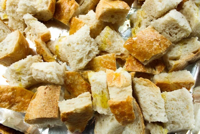 Start by making the panzanella croutons. These are crucial to a perfect panzanella. No store-bought/bagged croutons need apply. You’ve got to make your own for this recipe and it couldn’t be easier. Slice up the entire loaf into 1″ cubes.