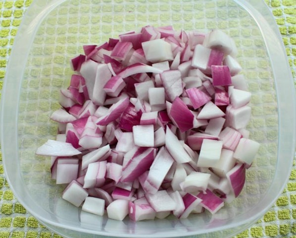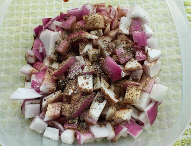 While the croutons are baking, marinate the onion. Chop and toss in a tupperware container with the remaining tbsp. of EVOO and balsamic vinegar. Top with a little salt and pepper, put the lid on, give a good shake, and let the onions marinate for at least 6 hours. These will keep for 1 week in a tupperware container in the fridge as well.