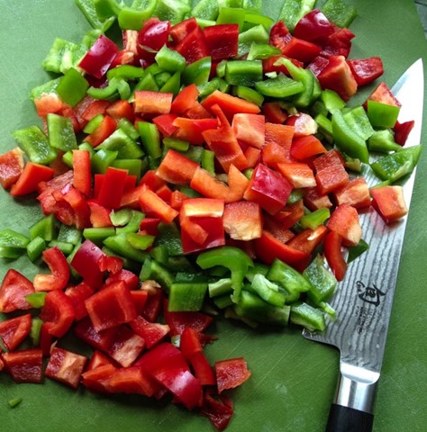 Next, chop the rest of the veggies and store in tupperware containers. I cut my peppers in advance and chop the cucumber and tomatoes day of. You can do whichever you prefer.