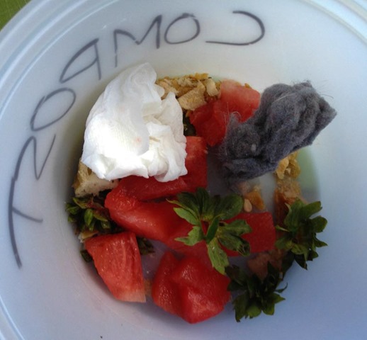 So let me tell you a bit more about how Bootstrap Compost works for us. We’ve been composting for a little over 2 months now; enough time that it now makes sense to write about. Each week we receive a 5 gallon bucket (with a super tight lid, no bugs or animal intruders can get in!). Over the course of the week we fill our bucket with compostable materials (more on that below). Every Wednesday our filled bucket is picked up by a Bootstrap staffer (on foot, by bike, by handtruck/cart, seldomly by car) and a clean bucket is left. Repeat for the next week! Super easy. The cost to us is $32/month. Well worth it.