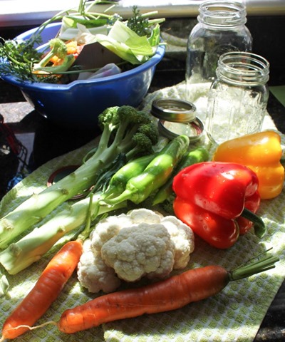 In a big quart sized mason jar pack all the veggies in as best you can. I was able to fit all but maybe a handful of the veggies (which I then just snacked on). Really push down so you can maximize how much will fit in the jar.