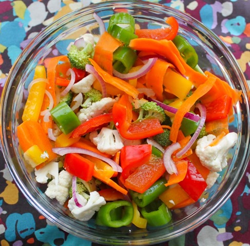 The next step is to prep the veggies! Wash thoroughly and cut all of the veggies into small, bite sized pieces. This takes a while because there are so many veggies but honestly I find this to be a peaceful task.