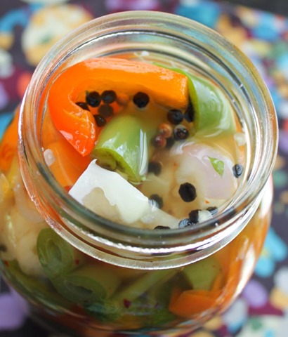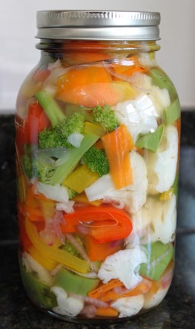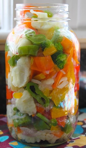Twist on the lid, give the jar a good shake, and store in the fridge for a minimum of 24 hours before eating. I found that a lot of recipes varied on how soon you could eat your giardiniera but I think 24 hours is your best bet (even better of you can rotate the jar upside-down 12 hours in to get even pickling coverage).