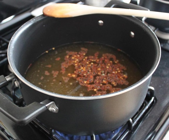 The brine/pickling liquid is really easy to prepare. Combine all of the ingredients in a pot and bring to a boil. Once it begins boiling, reduce to a low simmer and stir until the sugar and salt have dissolved. Cool the liquid down to room temperature before using it. I transferred mine to a mason jar to cool so I could use my sauce pot for the next step.