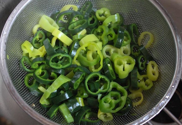 Next, fill up a sauce pot with water and bring to a boil. Blanch the peppers for 2-3 minutes, maximum. Drain the peppers well and let them cool for 7-10 minutes.