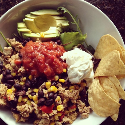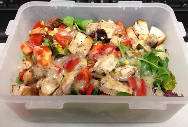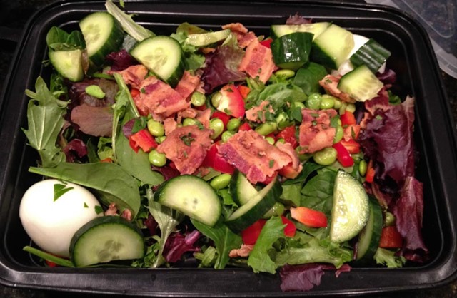 For lunch I’m a salad frequent flier. I will put literally anything and everything in a salad. Here is my go-to salad ingredient list: mixed greens, spinach, avocado, cucumber, bell pepper, banana peppers, peppadew peppers, marinated red onion, carrots, edamame, corn, bacon, chicken, tuna, hardboiled eggs, rice, lentils, quinoa, chickpeas, black beans, almonds, sunflower seeds, and on and on. My favorite salad dressings include balsamic vinaigrette, honey mustard, and salsa.