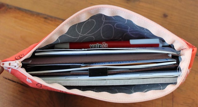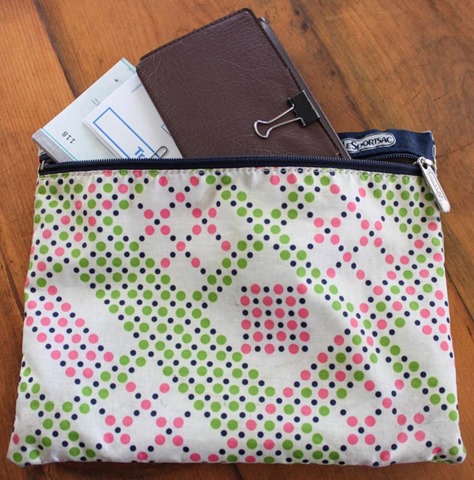 For years I had been using this old, ratty Lesportsac bag to carry my checkbook and checks (yes, I’m an old lady who keeps a checkbook). But its grodiness was finally too much to bear so I whipped up a new fabric checkbook bag.