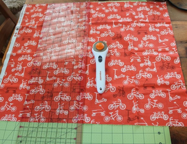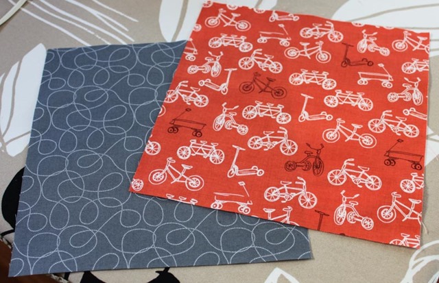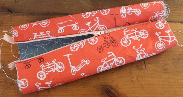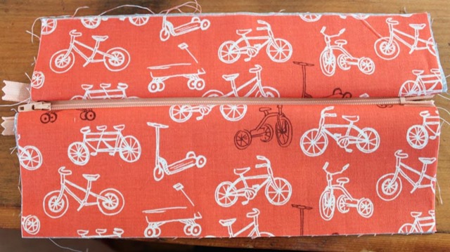 For this bag I used fabric I had in my stash (cute orange bicycle fabric for the outside and gray swirly pattern fabric for the inside) and bought a peach 9″ inch zipper.