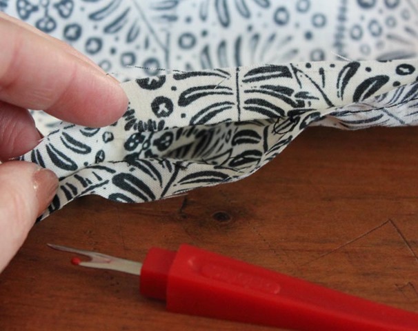 To create the bag I sewed around the entire exterior edge with a 1/2″ inch seam allowance, pivoting with my sewing machine foot up at each corner.