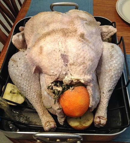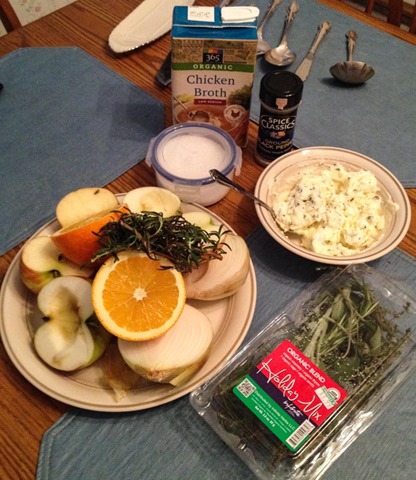 On Thanksgiving morning I prepped the additional ingredients right before roasting. Mix the butter (room temperature) and rosemary together and evenly spread under the skin. Stuff the cavity with the herb bundle, onion, orange, and apple. In the bottom of the pan pour the chicken stock and toss in the remaining apple pieces. Finally, pat the top of the turkey dry with paper towels and sprinkle on a dash and salt and pepper.