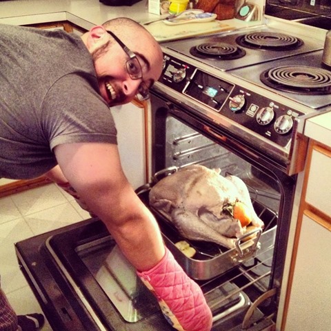 Roast the turkey on 400 degrees for the first hour. Then lower the heat to 350 degrees for the remainder of the cooking time. All told, our turkey took a little over 3.5 hours. The most important thing is that your meat thermometer (yes, you have to have one of these! don’t use the little plastic pop-up thingy!) reads 170 degrees. (The USDA says 165 is good, I think 170 is better, especially for dark meat.)