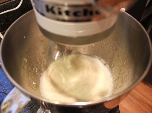 As the milk is simmering, make the whipped cream. It takes 3-4 minutes in a stand mixer with the whisk attachment. Whip the cream, sugar, and vanilla until it forms stiff peaks. This whipped cream will make 6 big scoop servings and will keep in the fridge in airtight container for 1 week.