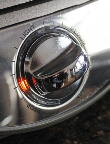 Before turning on the waffle maker you indicate your preferred doneness with the knob (light, medium, or dark). You then plug in the waffle maker to allow it to pre-heat. Once the waffle maker has pre-heated, it chimes letting you know it’s ready for batter. When you open the lid to add the batter the light indicator on the front goes all the way back to the first setting (see left picture). You add the batter, close the lid, and the light indicator moves in increments as the waffles cook. That way, you’ll know how done your waffle is instead of “peeking” inside. When the light gets all the way back to your cooking choice (mine here was medium, see right picture), it chimes again letting you know the waffles are done!