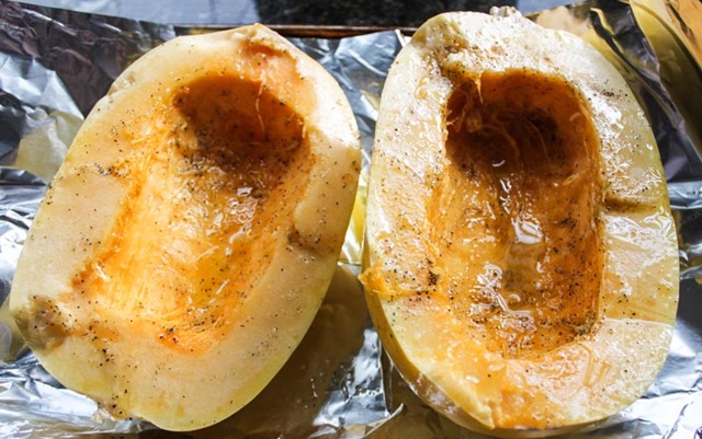 Next drizzle with olive oil, salt, and pepper, and give the spaghetti squash a good rub down – making sure that the entire surface is coated evenly.